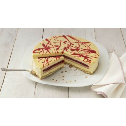 Pan di Spagna farcito con crema al frutto della passione e salsa ai lamponi, decorata con glassa al cioccolato bianco e lamponi.